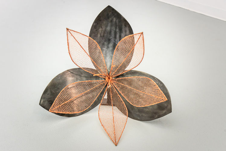 My process is based on traditional and hybrid techniques. I employ jewellery chain-making methods with copper wire and create blown glass elements for the rounded bead forms. The glass beads are electroplated electroplate with copper. Steel, used for the blue bead forms, is welded with an oxyacetylene torch and then shaped in the hotshop, where a glory hole is used as a forge to inflate the form.